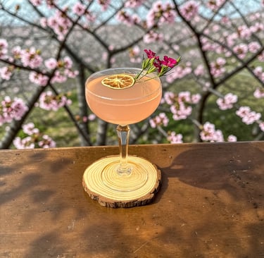 A Japanese style martini featuring Sakura Gin and sake. Subtle cherry blossom unfolds into sweet lychee and crisp white tea for a smooth, floral, and fruity Japanese cocktail celebrating Spring in Kyoto.