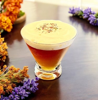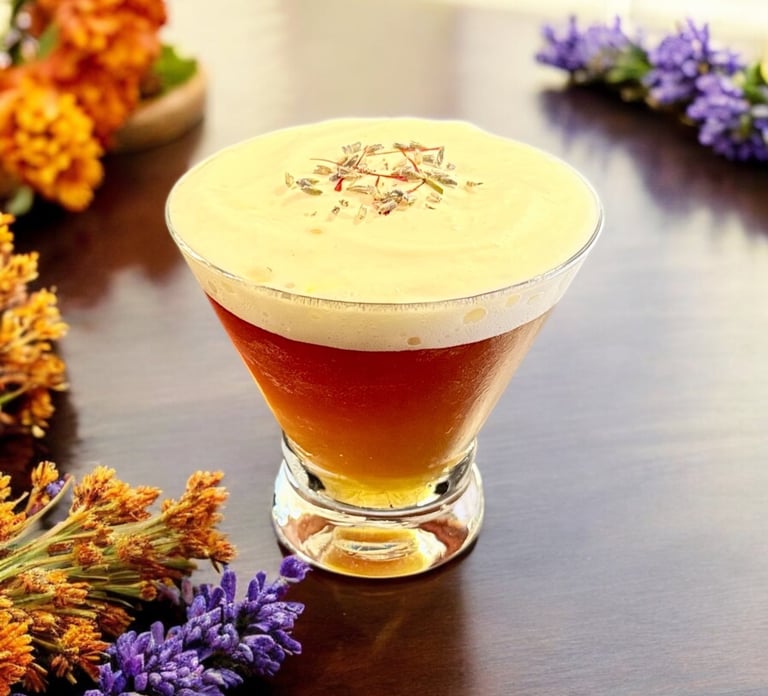A Latin style tequila coffee cocktail with a Spring twist. Tequila blanco is blended with vanilla and saffron infused espresso, special Amaro and a lavender accent for a uniquely flavorful golden carajillo.