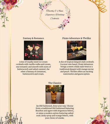 Weddings, holidays, or just because—it’s not a party ‘til the drinks make a statement. Each of my custom menus for weddings and private events are crafted to match your theme, wow your guests, and prove you have exceptional taste.