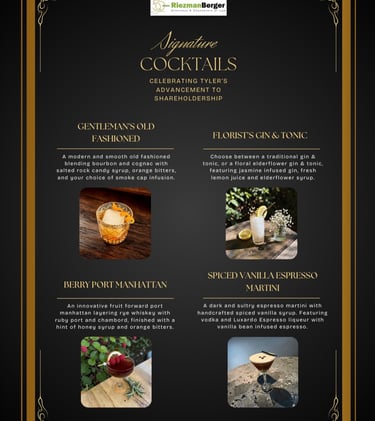 We hired Bender Mixology Services for a large corporate holiday party with 70 guests, and she exceeded expectation! From the very beginning, the planning process was seamless and stress- free. She created a custom menu, complete with beautifully designed signage that made it easy for everyone to choose their drinks.