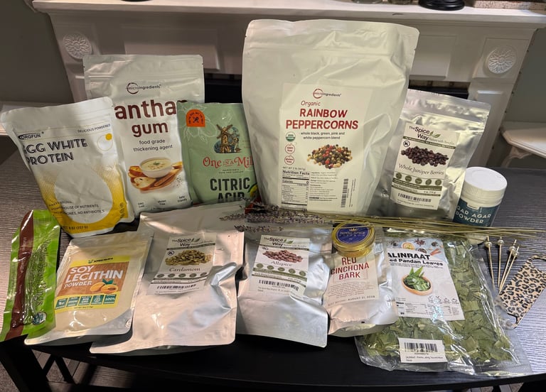 Powders- Soy Lethicin, Agar Agar, Xanthan Gum, Egg White Protein, Citric Acid, Malic Acid