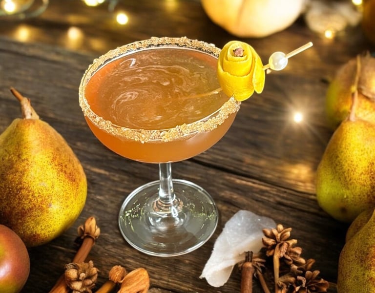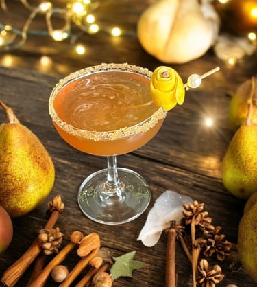 A festive, fruity twist on the classic Cognac Sour, featuring Spiced Pear Liqueur and a spiced sugar rim.